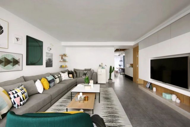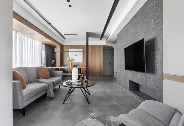 客厅在简约大方的空间基础下,铺上灰色的地砖,可以营造出端庄自然的客厅空间感,结合上舒适雅致的软装家具,更是让空间呈现出和谐轻松的惬意氛围。