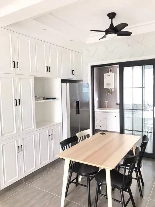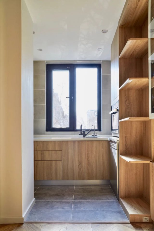 厨房作为加了一个相对紧凑的空间,地面铺设哑光防滑的灰色地砖是非常常见的选择,这样整体地面更加耐脏,设计效果也是非常简约大方。