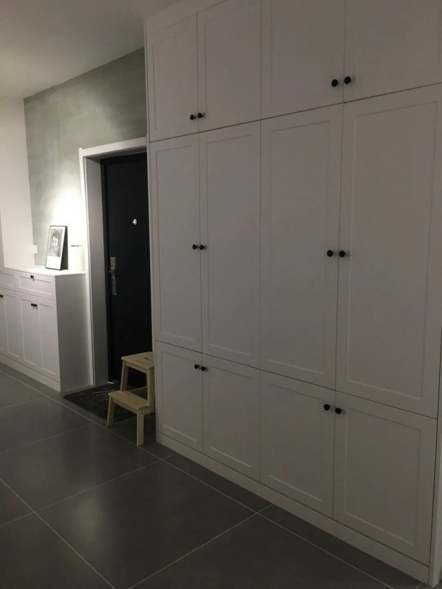 玄关是从室外回家后进入的第一个空间,以灰色地砖铺设玄关的地面,也是可以提供一个耐脏而又简约大方的回家仪式感。