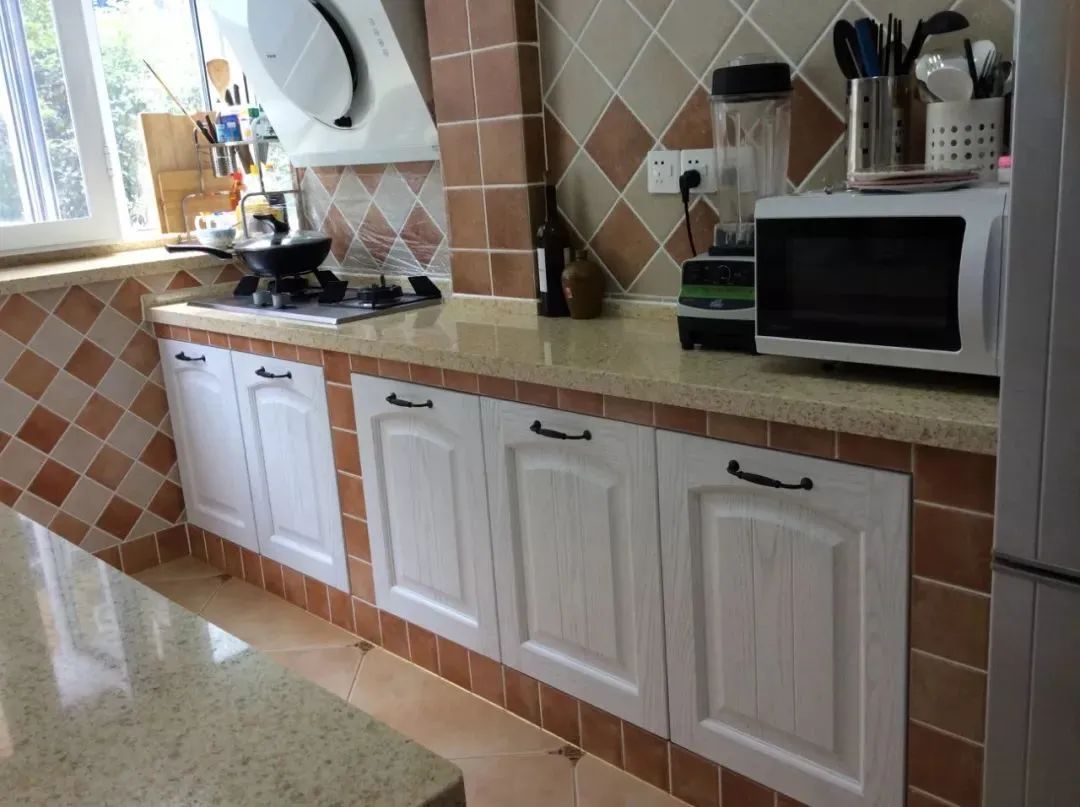 砖砌橱柜,用红砖砌,表面再贴瓷砖。